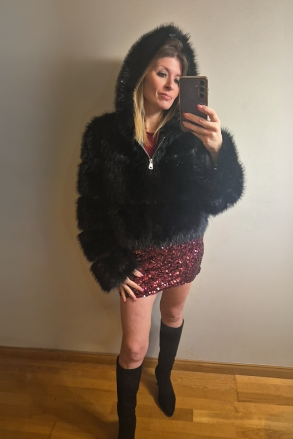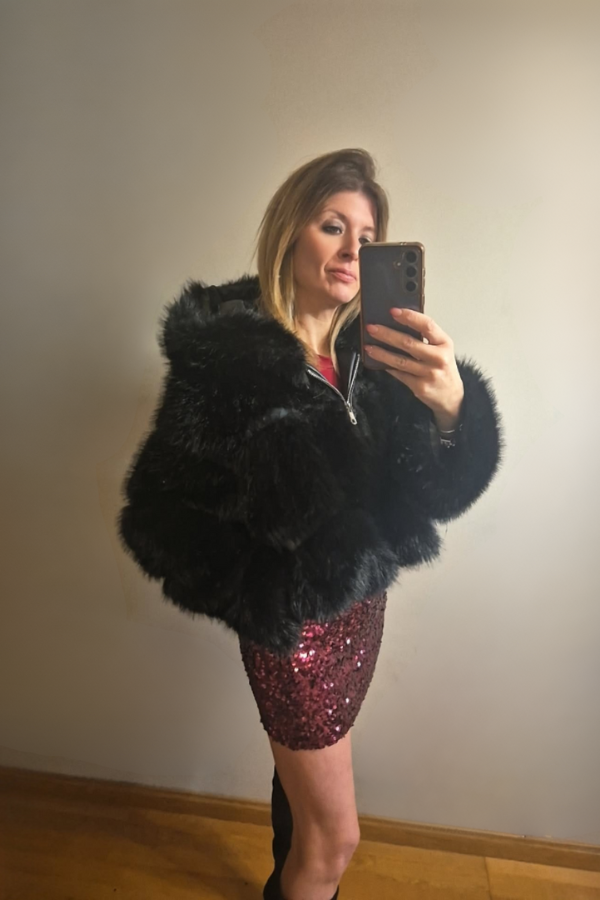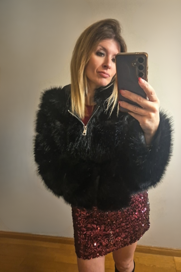 Chaquetita de pelo y polipiel con cremallera y capucha, combinando suavidad y carácter a la perfección.