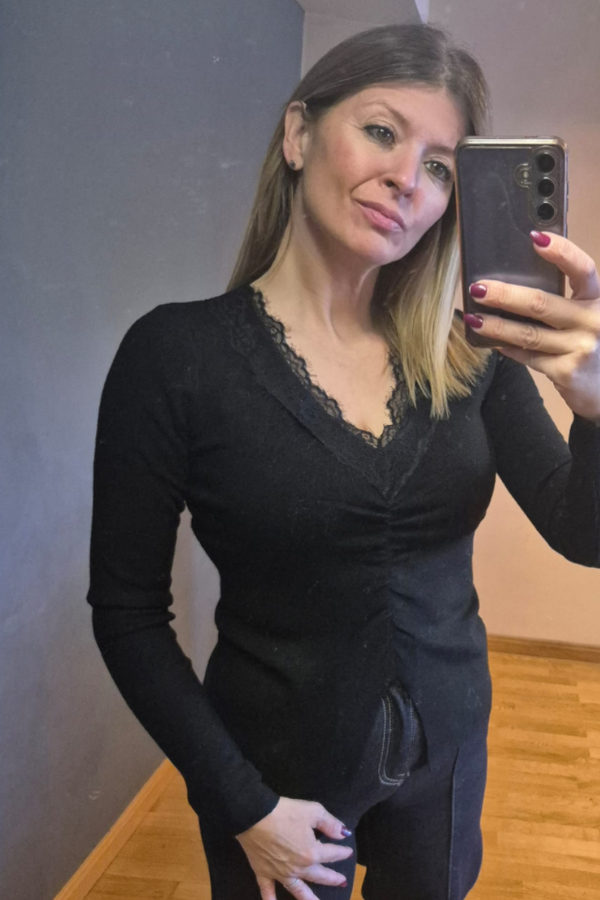 El diseño incluye un frunce delicado bajo el pecho , que realza la figura de manera natural, y una ligera abertura frontal que aporta toque sensual y moderno. Los detalles lenceros en el escote y los bordes elevan la prenda, convirtiéndola en un imprescindible versátil qu ese adapta a cualquier look.