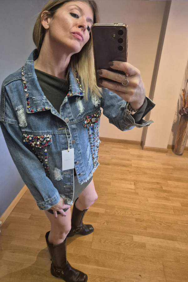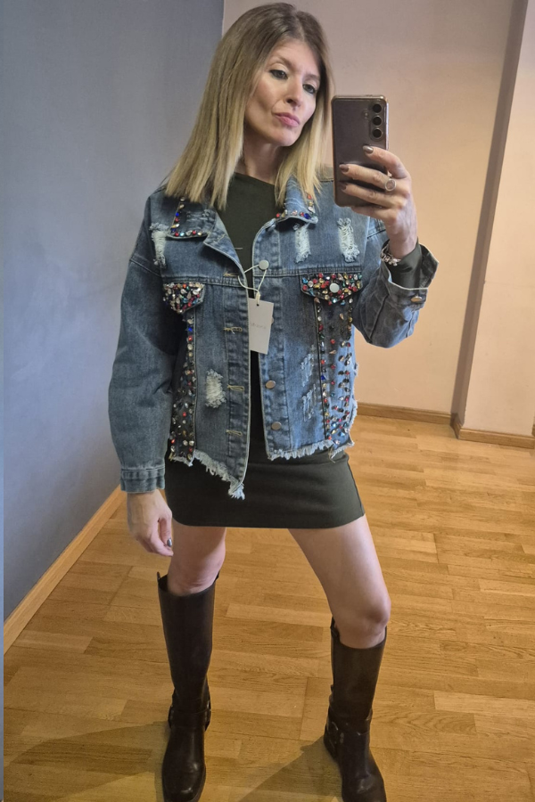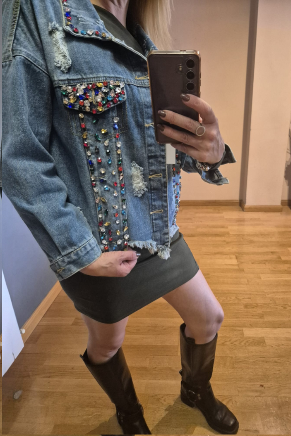 La cazadora Furia lo tiene todo: actitud, color y un aire desenfadado que marca la diferencia. Confeccionada en denim desgastado con roturas estratégicas, esta prenda se potencia con piedra s de colores que aportan brillo y un toque glam rock irresistible. Su silueta relajada y detalles únicos hacen que cada pieza sea una declaración de estilo. Ideal para quién se atreven a más. Furia es la chaqueta que transforma cualquier outfit en algo poderoso y original.