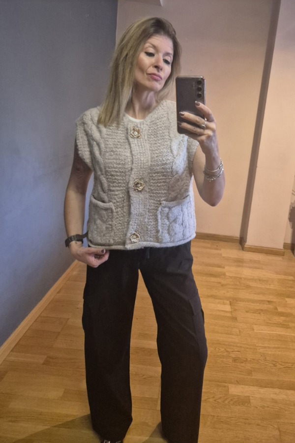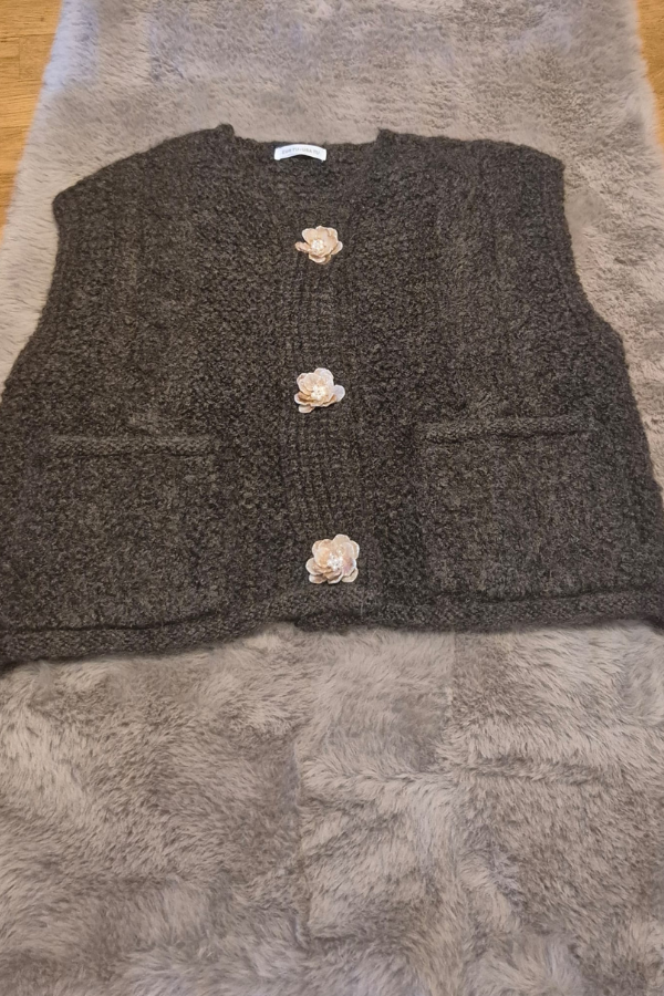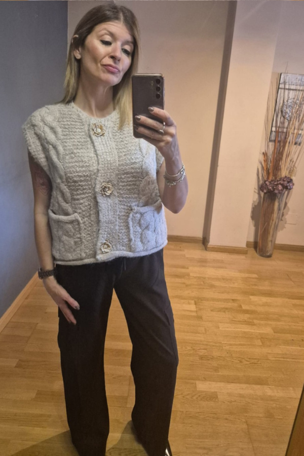 El detalle distintivo son los botones de gran tamaño con forma de flor, que actúa como cierre y como símbolo. Esa flor no solo une la prenda, sino que expresa lo esencial de su espíritu: belleza en lo simple, fuerza en lo delicado.