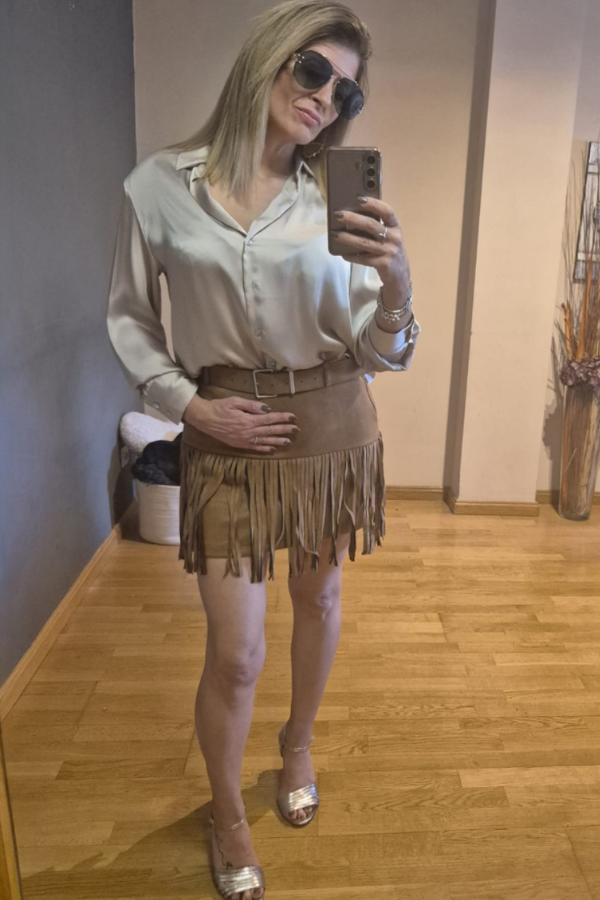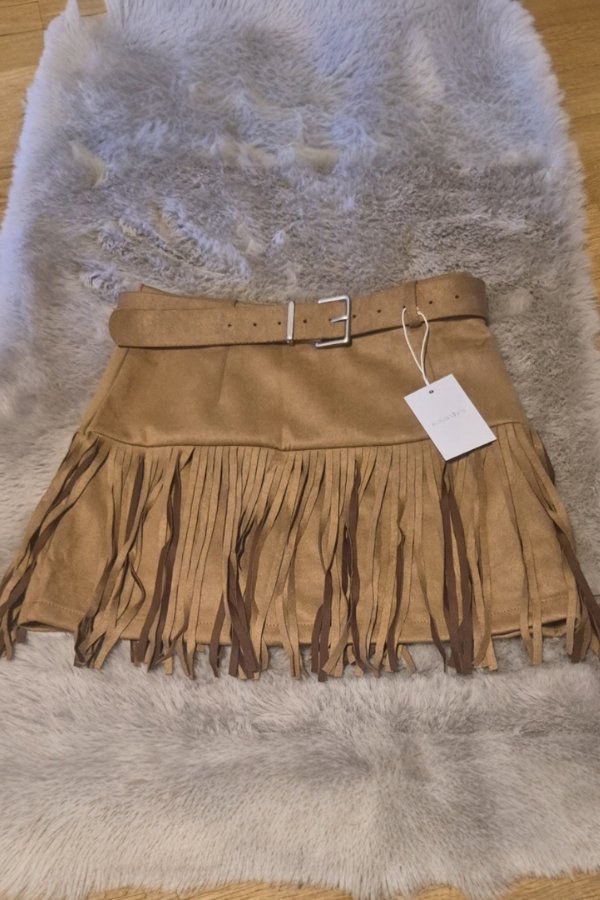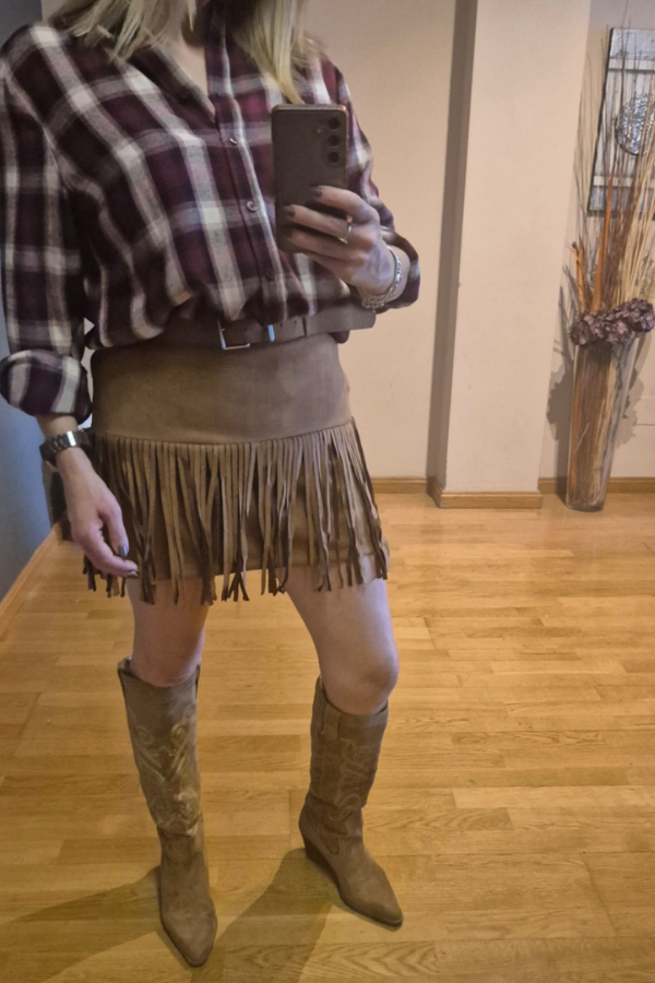Ritmo es una minifalda confeccionada en tejido de ante, suave al tacto y con estructura ligera que se mueve con naturalidad. Su diseño incorpora flecos que aportan dinamismo y fluidez, creando una silueta viva que responde a cada paso. De color marrón cálido y equipada con un cinturón del mismo tono, esta pieza define la cintura y suma carácter . Ritmo es más que una falda: expresión de movimiento , actitud y libertad. Una prenda que late con fuerza dentro de la colección First Vibes, pensada parra cuerpos que no se quedan quietos.