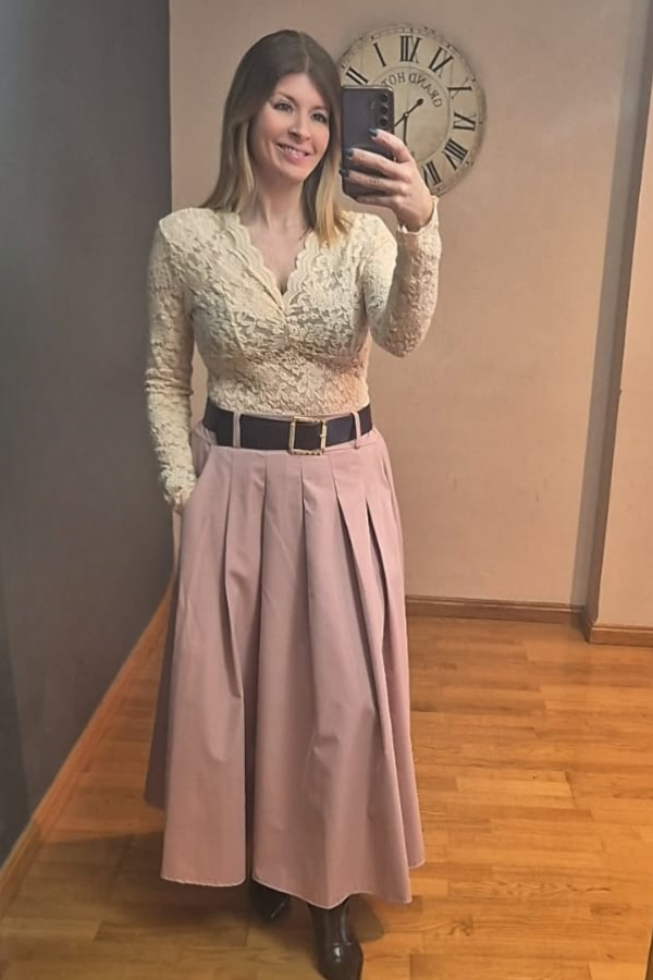 Corte amplio que genera vuelo, perfecto para moverse con estilo y comodidad. Confeccionada en tela impermeable, combina practicidad y moda, par días de look moderno y desenfadado.
