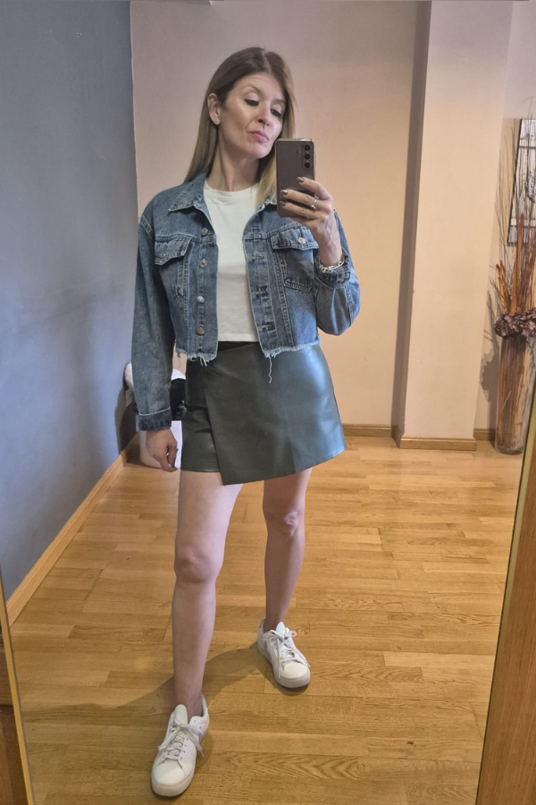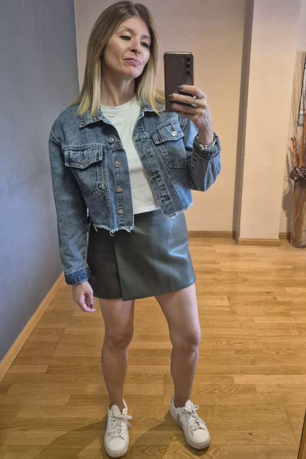 La falda Impulso es la combinación perfecta entre comodidad y tendencia. Confeccionada en polipiel suave de tono verde oliva, esta falta pantalón corta aporta un toque audaz y moderno a cualquier look. Su diseño tipo short interior garantiza libertad de movimiento sin perder el estilo femenino y sofisticado de una falta clásica. El acabado semi mate y la estructura definida le dan una estética urbana y chic, ideal para looks del día o noche.