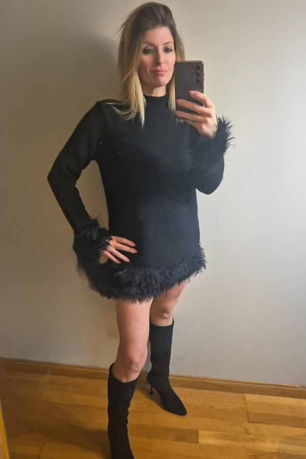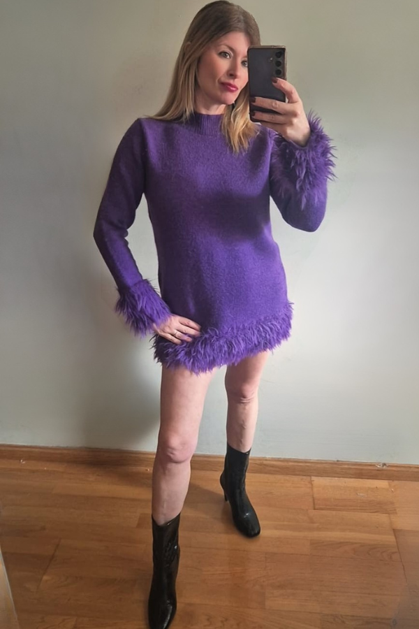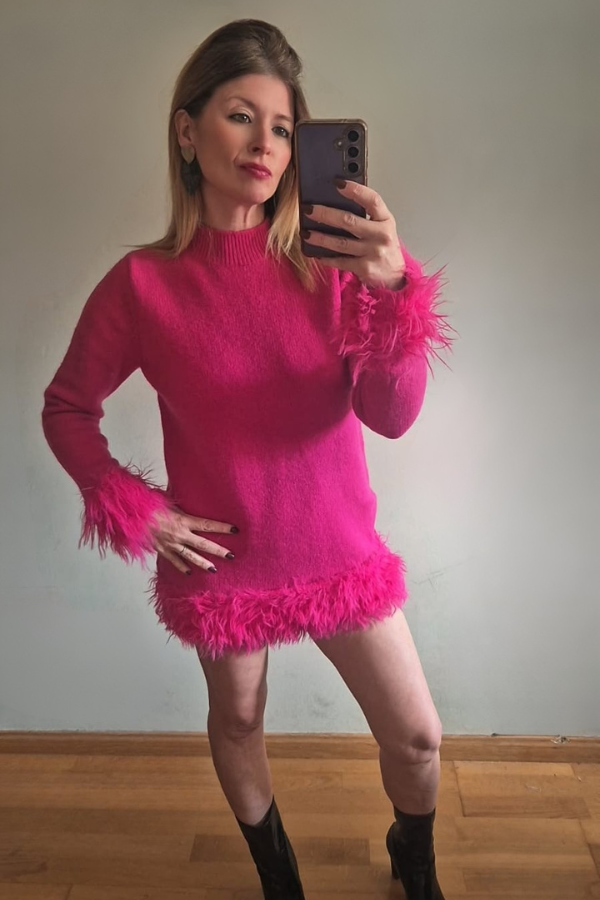 Detalle Pluma es un jersey largo, confeccionado en lana suave muy tupida, ofrece calidez y comodidad. Cuenta con delicados detalles de plumitas discretas en puños y en el borde inferior, aportando un toque elegante y original.