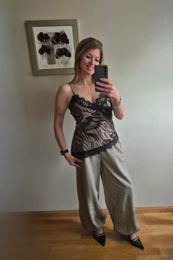 Sus finas tiras y detalle lencero en el escote aportan un toque sofisticado, evocando la elegancia de lencera sin perder versatilidad.