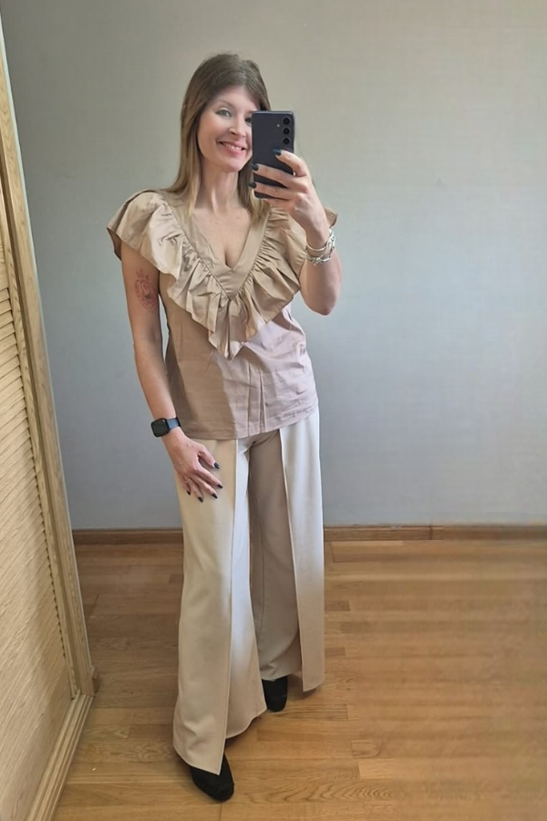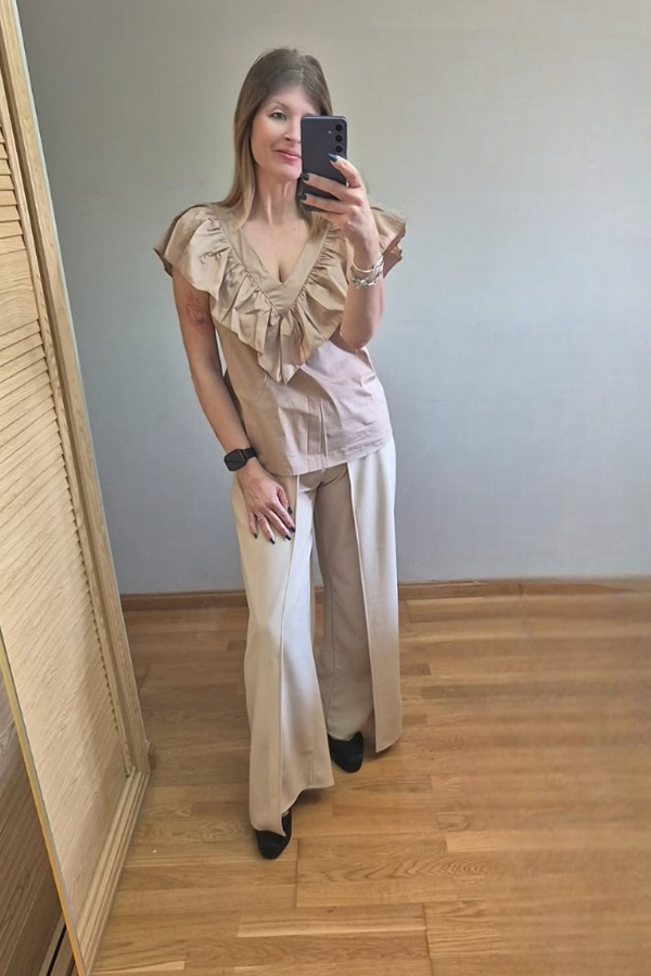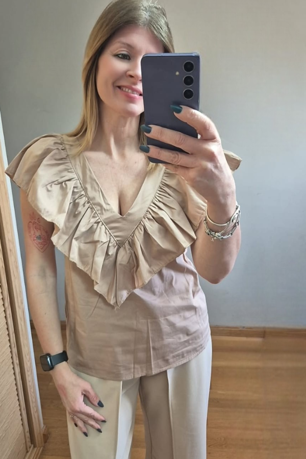 Top básico en pico, con detalle volante que aporta a la prenda personalidad y estilo.